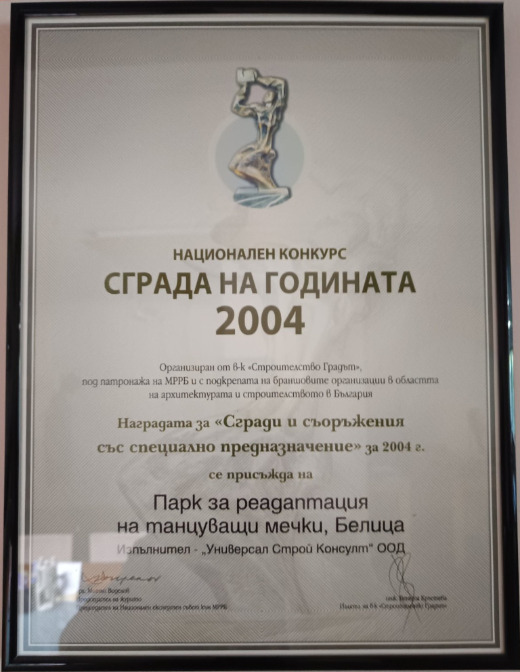 - 2004 г. - СГРАДА НА ГОДИНАТА - Награда за "Сгради и съоражения със специално предназначение" за парк за танцуващи мечки, Белица.